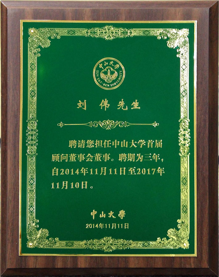 据了解,中山大学顾问董事会是由具有较高学术地位和社会声望的各界专家、校友、社会贤达组成的高层决策咨询、参谋机构,是学校与社会各界全面、紧密合作的桥梁和纽带。2014年,刘伟先生被正式聘请担任首届顾问董事会董事,聘期三年。